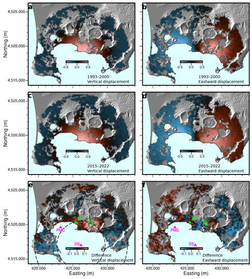In addition to the above described local features, Figure 7f shows two noticeable very large lobes of positive and negative values to the west and east, respectively. Although less clear and regular, Figure 7e also espies a large annulus of negative (southernmost parts mainly) or at least less positive values; the annulus is approximately centered at DS. The large size of this last feature and related colors indicate inflation of a deep deformation source, that we tentatively relate to the reservoir at about 8 km depth (e.g., [8,17,34]). As the spatial size of the lateral lobes is much larger during 2015–2022 (Figure 7d) than 1993–2000 (Figure 7b), the deep-source activity was probably higher during 2015–2022 than during 1993–2000.