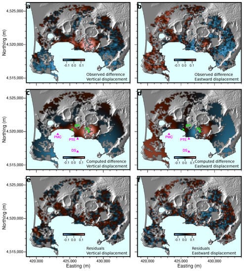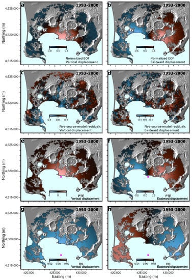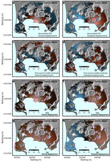 Now we test whether inflation/deflation of simple deformation sources below RFI, PMC, PS, PTE and DS (Figure 1) can justify most of the deformation features that we have just evidenced in Figure 7e,f. To avoid possible overmodeling induced by noise and very local features, for simplicity we follow the approach described in Section 2.4. Figure 8c–f show computed differences between 1993–2000 and 2015–2022 normalized EOFs and model residuals when the aspect ratio (polar to equatorial radius) of the PMC, RFI and PS is 0.25; depths are 1000 m, 1000 m and 1500 m, respectively. The PTE and DS radii are 2000 m and 5000 m; depths are 3000 m and 8000 m. Because of the “focusing effect” (Section 2.3), depths of the PTE and PS are consistent with [29]. It is hard to quantify rock heterogeneity effects on a source as deep as the DS. Several tests show that changing depths by hundreds of meters does not affect our results appreciably; also the aspect ratio of spheroids is not resolved robustly. Figure 9 shows the contribution of each deformation source to the computed differences between 1993–2000 and 2015–2022 normalized EOFs.