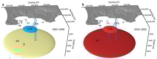 Cartoons of the dynamics of the PTE, DS, PS, RFI and PMC deformation sources in different periods. (a), 1993–1999; (b), 2015–2022. The time period in (a) is 1993–1999 instead of 1993–2000 (as from 1993-2000 SAR data) to exclude the 2000 mini-uplift (see Figure 2). Reddish colors indicate source inflation, cyan indicates deflation and yellow indicates lack of reliable detected activity, emphasized by question marks. Empty blue arrows schematize possible magmatic fluid transfers from the DS and PTE.