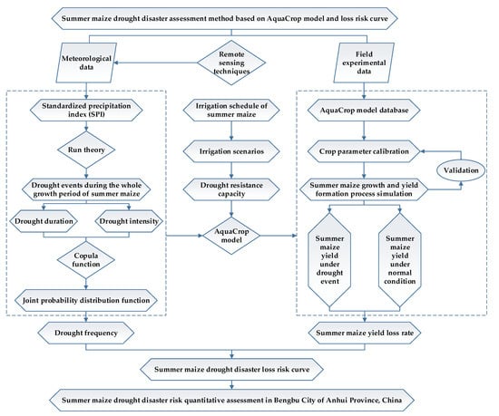 With the impacts of climate change and human activities, agricultural drought disaster losses have increased remarkably. Drought disaster risk assessment is a prerequisite for formulating disaster reduction strategies and ensuring food security. However, drought disaster risk is a complex system, and quantitative assessment methods reflecting the risk formation mechanism are still rarely reported. This study presented a chain transmission system structure of drought disaster risk, which meant that drought disaster loss risk R was derived from drought hazard H by the transformation of drought disaster vulnerability V. Based on this point, firstly, a drought hazard curve between drought intensity and drought frequency was established using remote sensing data and the copula function. Then, a crop loss calculation approach under various drought events and drought resistance capacity scenarios was achieved by two-season field experiments and the AquaCrop model. Finally, a loss risk curve cluster of “drought frequency–drought resistance capacity–yield loss rate” was proposed by the composition of the above two quantitative relationships. The results of the case study for summer maize in Bengbu City indicated that the average yield loss rate under 19 droughts occurring during the growth period of maize from 1982 to 2017 was 24.51%. High risk happened in 1988, 1992, 1994, 2001, and 2004, with the largest loss rate in 2001, up to 65.58%. Overall, droughts with a return period less than two years occurred frequently during the growth period of summer maize in Bengbu, though the loss risk was still controllable. In conclusion, the results suggest that the loss risk curve provides a new effective method of drought disaster risk quantitative assessment from a physical mechanism perspective, which lays a scientific foundation for decision-making in risk management.