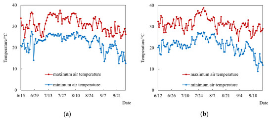 Daily maximum and minimum air temperature during the whole growth period of summer maize at the experimental station. (a) 2018 season; (b) 2019 season.