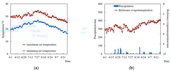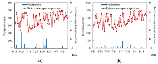 Daily precipitation and reference evapotranspiration during the whole growth period of summer maize at the experimental station. (a) 2018 season; (b) 2019 season.
