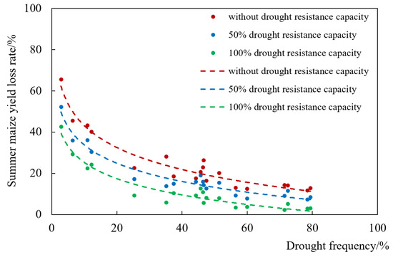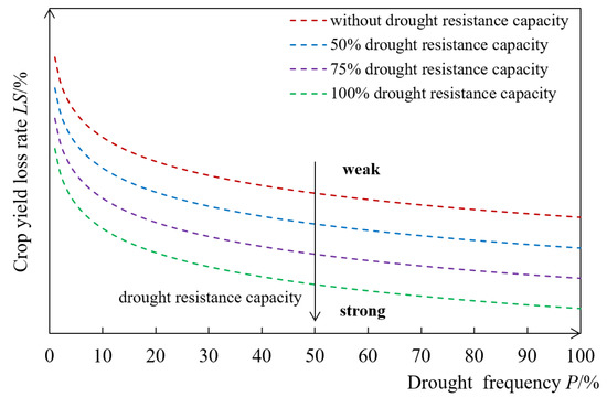 In fact, the drought resistance capacity is generally not constant but decreases with the increase of drought severity. The lower the drought frequency, the lower the available water resource amount, and the weaker the drought resistance capacity. Therefore, to assess the drought disaster risk under an actual drought resistance capacity, firstly, the quantitative relationship between drought resistance capacity and drought frequency should be built. For a given frequency, the actual resistance capacity can be obtained. Then, according to the established loss risk curve cluster under various resistance capacities in this study (Figure 7), the crop yield loss rate under the given frequency and resistance capacity can be obtained by interpolation. Thus, the loss risk curve between drought frequency and the corresponding crop yield loss rate under the actual drought resistance capacity is established, which may represent important future work on the basis of this study.