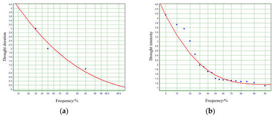 Drought duration and drought intensity can generally be described by exponential distribution and gamma distribution, respectively. However, some studies have indicated that the fitting effects of exponential and gamma distributions were not adequate [43,44]. Therefore, in this study, the empirical frequency of drought duration and drought intensity were calculated by the formula of mathematical expectation, and the P-III distribution function was used to fit the empirical frequency points.