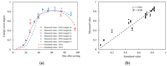The crop parameter of maximum canopy cover in the AquaCrop model for summer maize in this study is 78%. First, the simulated canopy cover degrees are highly consistent with the field measured results (Figure 11). Then, the measured samples of maize maximum canopy cover degree in 2018 and 2019 seasons are only 80.15% and 85.00%, respectively. The field experiments in this study are conducted under a rain-fed condition; the water demand of maize plants cannot be fully met. According to the measured gravimetric soil water content during the growth period of maize (Figure 19), the values are basically lower than 75% field capacity (19.65%). Furthermore, the measured yields per unit area in 2018 and 2019 seasons are 5.54 t/hm2 and 5.88 t/hm2 (Table 5), respectively, which are both less than that under normal meteorological conditions (5.94 t/hm2). This reflects that there is significant drought stress for maize plant growth in the experiments, resulting in a maximum canopy cover degree of only about 80%. Similar results were proposed by Abedinpour et al. [65], who found that the maximum canopy cover degree of maize decreased with the declining of soil water content in New Delhi, India; those under full irrigation and rain-fed conditions were about 90% and 80%, respectively. Moreover, the maximum canopy cover parameter of 78% may be related to the planting density, meteorological conditions, and maize variety [66]. A relatively low maximum canopy cover parameter of maize in the AquaCrop model was also obtained in some studies. Nyakudya et al. [66] calibrated the parameter of maximum canopy cover CCx for rain-fed maize in a semi-arid region of Zimbabwe by field experiments in various sites, and the CCx in the Magaranhewe site and Chongma site was 70% and 65%, respectively. Ran et al. [67] presented that the calibrated CCx for summer maize in an arid region of northwest China during the 2012 and 2013 seasons was 85%, and the field measured maximum canopy cover degree was about 80%. Furthermore, in the study of Li et al. [68], the calibrated CCx for summer maize in the Shijin irrigation district of North China was 80%. Therefore, it can be considered that the CCx of 78% for maize in this study is reasonable.