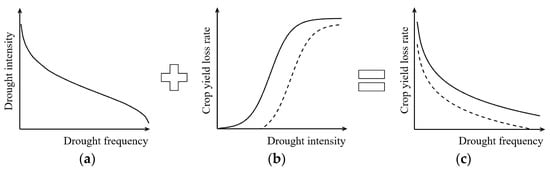 Drought disaster risk in this study is defined as the quantitative relationship between the possibility of future drought events with different intensities and the corresponding possible losses of drought disaster-bearing bodies. Further to the perspective of the drought disaster risk system structure, drought disaster loss risk (R) is a system output resulting from system input, i.e., the hazard of drought disaster–causing factor (H) by system transformation, i.e., the vulnerability of the drought disaster–bearing body (V), expressed as R = f (H, V) [16,17]. Thus, it can be considered that drought disaster risk has a chain transmission system structure, which consists of the element structure of H, V, and R and the relation structure among these three. Drought hazard can be described quantitatively by the relation curve between drought intensity and the occurrence frequency of the corresponding drought event [18,19]. Drought disaster vulnerability can be described quantitatively by the relation curve between drought intensity and the corresponding losses of the disaster-bearing body [20,21]. Therefore, the drought disaster loss risk curve between drought possibility and the corresponding losses is obtained from the transformation of the drought hazard curve through to the drought disaster vulnerability curve. This loss risk curve method can fully reflect the drought disaster risk system structure and the risk formation mechanism [22]. However, there are a few studies focusing on this. In addition, the scenario simulation of crop modelling is an effective approach to establishing the drought disaster loss risk curve [23,24]. Crop models simulate the growth process of crops under drought stress by using statistical and dynamic methods, which can reveal the quantitative response relationship of crop growth and yield formation to drought.