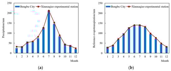 Comparison between mean monthly precipitation and reference evapotranspiration in Xinmaqiao station and Bengbu City. (a) Precipitation; (b) reference evapotranspiration.