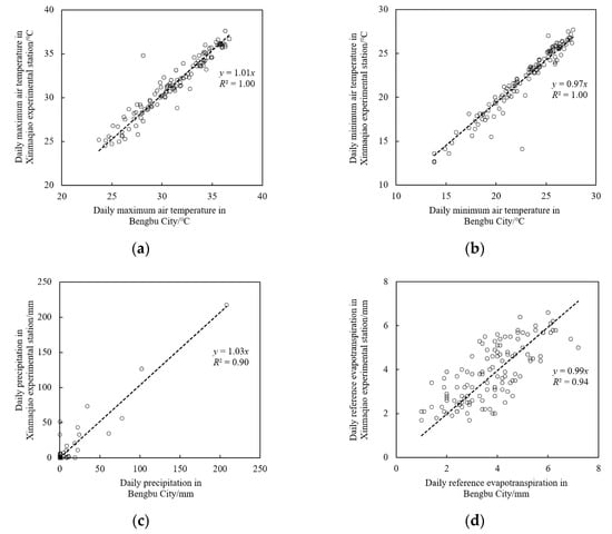 Correlations between main daily meteorological indexes during the growth period of summer maize for the 2018 season in Xinmaqiao station and Bengbu City. (a) Maximum air temperature; (b) minimum air temperature; (c) precipitation; (d) reference evapotranspiration.