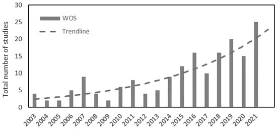 Number of rice and wheat N retrieval research studies per year from 2003 to 2021.