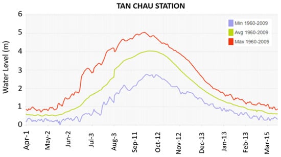 Water level at Tan Chau gauge station in An Giang province from 1960 to 2009 (http://portal.mrcmekong.org/charts/chart, accessed on 1 January 2020).
