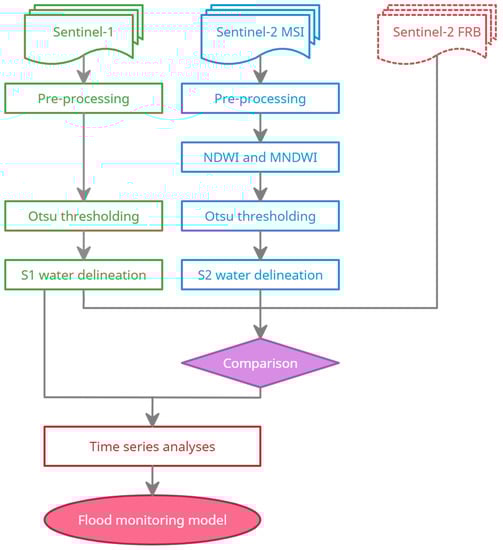 Figure 3 shows the flowchart of surface water mapping and flood monitoring using the Sentinel-1 image time series. Green section, Sentinel-1 images are pre-processed and then applied the automatic Otsu thresholding algorithm for water delineation. Blue section, Sentinel-2 MSI images are first pre-processed to generate normalized difference water index (NDWI) and modified normalized difference water index (MNDWI) products. The automatic Otsu threshold is then applied similarly on the derived NDWI and MNDWI products for water delineation. Next, a comparison between surface water maps derived from Sentinel-1 SAR data, optical Sentinel-2 MSI data, and Sentinel-2 FRB images is performed to estimate the ability to apply the Otsu thresholding algorithm on Sentinel-1 SAR data for mapping surface water. Finally, a flood mapping algorithm is developed for monitoring flood water extent in NRT using a sequence of time series analyses based on the change detection approach.