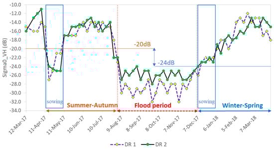 Sentinel-1 backscatter of crop phenology at two random samples, DR1 (10.47°N and 105.17°E) and DR2 (10.63°N and 105.51°E), cultivating two rice seasons a year (summer-autumn and autumn-winter seasons). The summer-autumn rice season is from April to July (right before the flood). The winter-spring rice season begins from December (right after the flood) to March. Another rice season could be possible in the flooding period from August to November for the areas that are protected by the dike system (autumn-winter season).