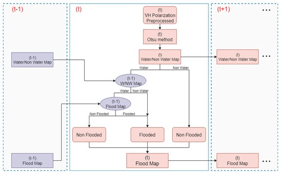 Finally, all pixels are classified into flooded and non-flooded, and the flood map at the time is generated. The current maps at time , including water/non-water and flooded/non-flooded maps, are continuously used as the references for the succeeding process at time .