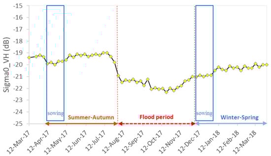Image thresholding is an efficient technique for SAR data analysis, which is fast, cost-effective, and accurate for surface water mapping, flood monitoring, and LULC classification [,,]. For instance, Twele et al. [] developed a NRT processing chain for flood detection by using a thresholding method to separate water and non-water area. Thresholding was also applied in an experiment for mapping vegetation in flooded areas using Sentinel-1 SAR data []. Similarly, a threshold was utilized on Sentinel-1A and TanDEM-X imagery for mapping wetland areas []. Finding a robust threshold that works for different sites and different images is a challenging task because the threshold depends on a number of factors, such as atmospheric conditions, mixed pixels, spatial resolution, and viewing angle of the satellite image []. Meanwhile, a fixed and empirical threshold was regularly employed on the Sentinel-1 SAR data for LULC classification in the VMD, e.g., land cover classification of An Giang province [] and rice extent mapping in the Mekong Delta []. However, different rice seasons in the VMD have different features, growing environments, and weather conditions, which could lead to changes in backscatter intensity, especially the complexities of mixed pixels of vegetation, soil, and water in the paddy fields. Figure 6 shows a significant difference between the two rice seasons (summer-autumn and winter-spring). Rice in the summer-autumn season has lower backscatter in the sowing and vegetative stages. The minimum VH polarization backscatter intensity in the summer-autumn season is around −20 dB, while it is around −24 dB in the winter-spring season. For this reason, instead of an empirical threshold for the entire year, each image should have applied an adaptive or a specific threshold to separate water from non-water areas.