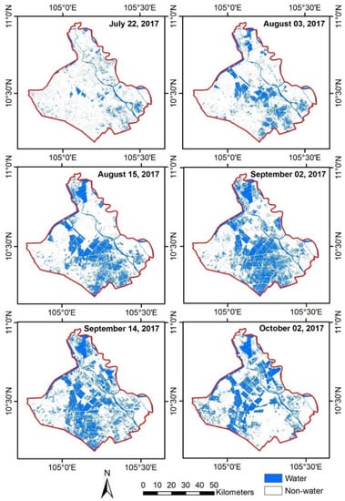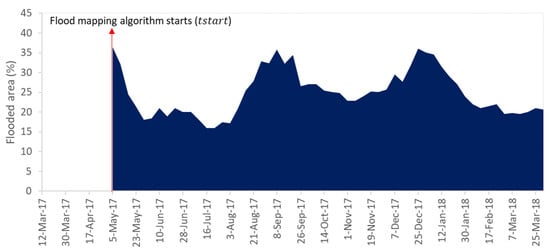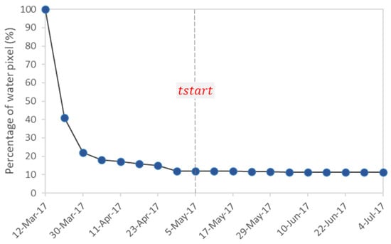 It should be noted that the algorithm needs an initial flood map for generating the next images; thus, we assumed that the initial flood map on March 12, 2017 (the driest month in the VMD []) is all non-flooded to activate the flood monitoring algorithm. However, An Giang province is a very complex area in terms of water dynamics and vegetation existence, such as rice cultivation [], hydrological variations [], a full-dike system for water management [], and differences in agricultural calendar practices. The assumption that all pixels in the initial flood map on 12 March 2017 are non-flooded could make the model work, but the water pixels in the initial surface water map could potentially be flooded. Therefore, we adjusted the model by identifying the time that all the dynamic water pixels in the initial water/non-water map on 12 March 2017 changed to non-water. The dynamic water pixel is identified as a water pixel that changes over a period and is not a static water pixel in the lakes or rivers. This adjustment enables the accurate starting time () for the flood monitoring algorithm.