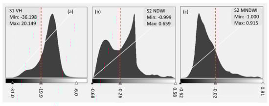 Histograms of Sentinel-1 VH (a), Sentinel-2 NDWI (b), and Sentinel-2 MNDWI (c) images acquired on 11 April 2017. The dashed lines in red color are the optimal Otsu thresholds.