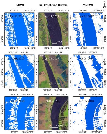 Two water indices (NDWI and MNDWI) are mature and tested in many previous studies for waterbodies mapping [,,,]. However, the impacts of the mixture of built-up, soil, and vegetation areas cause relatively low performance in the classification results using the NDWI, which is improved significantly from the use of the MNDWI [,,]. Particularly, An Giang province is crossed by two main Mekong River branches (Tien and Hau rivers) and a dense system of rivers and canals, so the waterway is the most popular transportation and the locals habitually build houses along the rivers. The mixture of soil, vegetation, and water is also prevalent in An Giang because it is the major province for cultivated rice production in Vietnam []. The government developed a full-dike system in An Giang province for water management and to increase the productivity of agricultural activities in this region []. Therefore, a necessary comparison of surface water maps derived from Sentinel-2 NDWI and MNDWI products is needed to understand the impact of built-up and mixed pixels, especially for riverbank areas and paddy fields. This test used Sentinel-2 FRB images with highlights of vegetation (e.g., rice) and water to evaluate two surface water maps (NDWI and MNDWI) by visually comparing water boundaries on several cloud-free subsets, and then finalizing which water index is better for surface water detection in An Giang province. The Sentinel-2 FRB images were further used to visually compare with surface water maps derived from the SAR Sentinel-1 VH images.