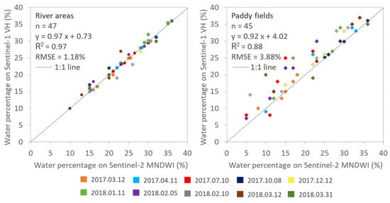 Figure 13 shows the statistical comparison of water detections using the automatic Otsu thresholding algorithm on the SAR Sentinel-1 VH images and Sentinel-2 MNDWI images. A total of 47 and 45 cloud-free subsets in river areas and paddy fields ranging from 0.5 to 12 km2 were selected from the 10 pairs of Sentinel-1 and Sentinel-2 images, respectively. In the river areas, the water percentage in all subsets derived from Sentinel-1 VH images was strongly correlated to the water percentage derived from the Sentinel-2 MNDWI images. All samples distributed along the 1:1 line, slope ~1.0, R2 = 0.97, and RMSE = 1.18%. In paddy fields, although a strong correlation was found (R2 = 0.88 and RMSE = 3.88%), the water proportion derived from the Sentinel-1 VH images was generally larger than deriving from the Sentinel-2 MNDWI images. The higher water proportion is perhaps due to the capability of Sentinel-1 to detect water in the sowing period with a level <5 cm (Section 4.1.1). The statistical comparison with the Sentinel-2 MNDWI images indicated that using the dynamic Otsu thresholding algorithm on the Sentinel-1 SAR image time series effectively captures surface water in An Giang province.