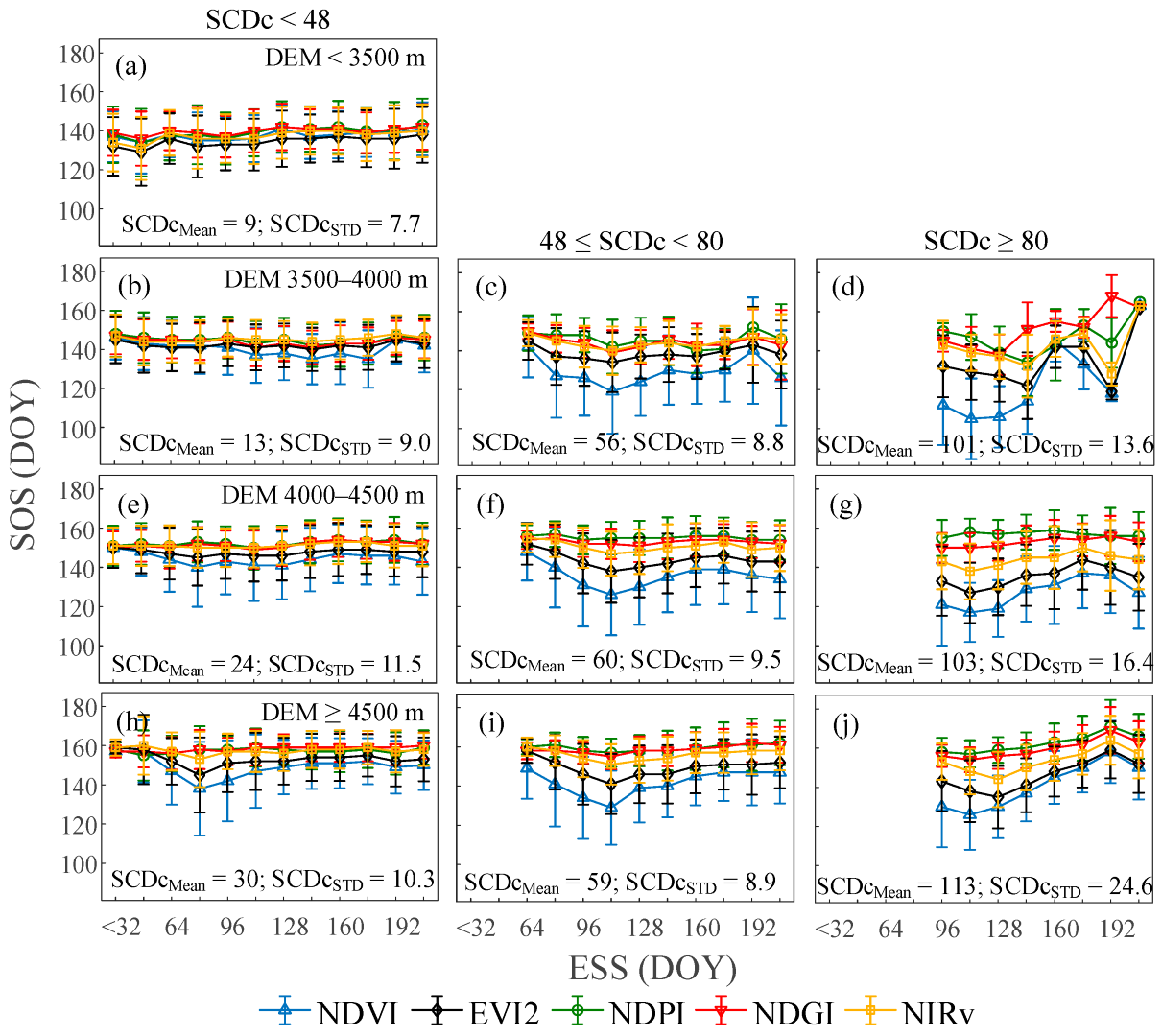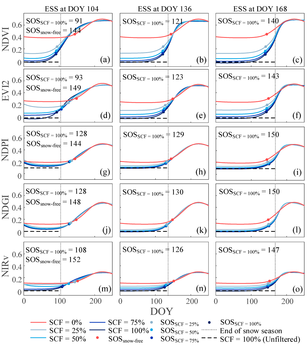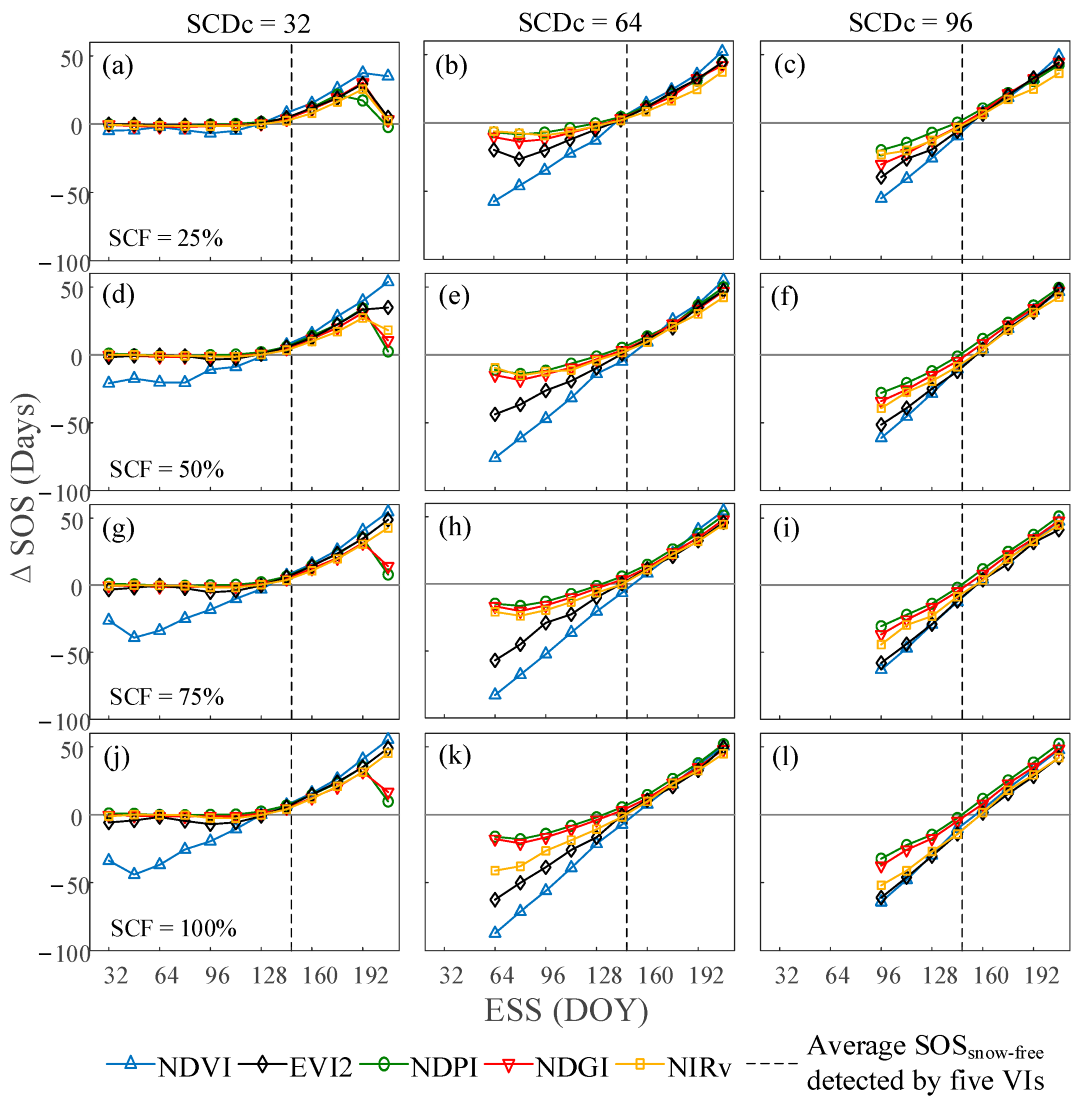 3.3. Effect of Snow Cover on Detecting SOS from VIs