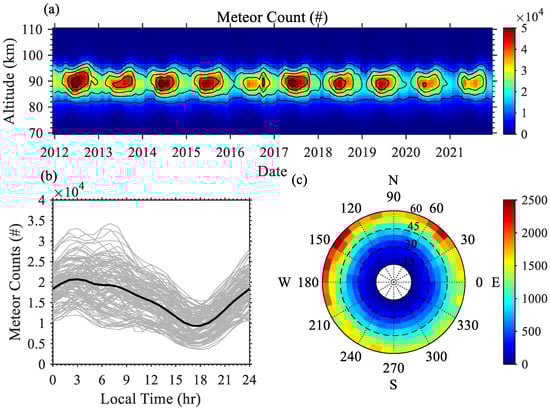 (a) Altitudinal variation of the selected meteor counts (#) in each month for the period between 2012 and 2021. (b) Local-time variation of the meteor counts in a 1-h bin for each month (grey). The black line is the average value. (c) Azimuth-zenith distribution of the meteor counts in January 2012.