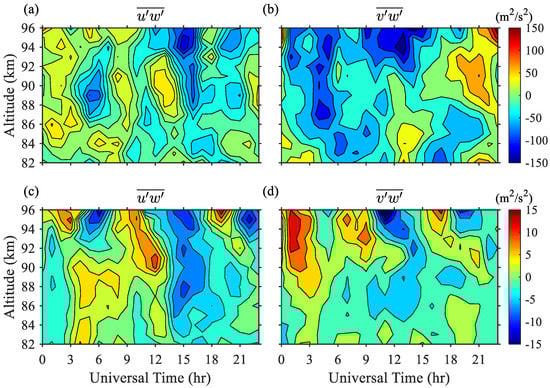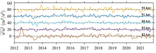 In the present work, we roughly follow the MCD method to reduce the impact of the tides and PWs. The detailed data processing is described as follows: (1) The data of are divided into the 3-km height and 2-h bin with the stepping of 1-km and 1-h. The conventional CD method is used to estimate the GW momentum fluxes. Notably, if the deviation of and is larger than the three times standard deviations in each bin, we would exclude those data for basic quality control. If the data number is less than seven and 30 in each time/height bin, we will discard them in the estimation of mean wind and GW momentum fluxes, respectively. (2) Calculating the mean horizonal wind in each time/height bin for every day and fitting the tides and 2-day PWs in a 3-day window with a 1-day sliding. Then, the fitting tides and PWs are projected to the measured data points () and replace . (3) Compositing the in each month and inferring the artificial GW momentum fluxes, caused by the fitting tides and the PWs in each bin. Finally, subtracting the artificial GW momentum fluxes from those estimated in step (1). Figure 2a,b illustrates an example of the GW zonal and meridional momentum fluxes using the above processes (MCD method) in January 2012. The results infer that the tides and PWs would contaminate the estimated GW momentum fluxes by about 10%, which is in similar magnitude, shown in the work by Andrioli et al. []. In addition, the data processing also have the capability to retrieve the wind variances in reasonable magnitude in this work. Notably, the method also has a limitation in that if the data points are inadequate, the variance of the vertical wind () will be estimated as negative values in mathematics, which is not reasonable in physics. We hope to focus on the GW momentum fluxes in this paper, so the wind variance is not displayed here.