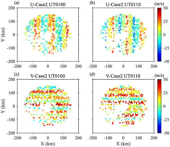 The prescribed constructing wind, considered the zonal and meridional mean winds (), diurnal and semidiurnal tides (), 2-day PWs (), and different N kinds of GWs (). (ki, li, mi) are the zonal, meridional, and vertical wavenumber of the i-kind GW, and TGWi describes the corresponding GW period. The symbols of x, y, and z indicate the location of the detected meteors in east, north, and vertical direction taken by the radar as the coordinate origin. θ and φ are the zenith and azimuth angles. t is the universal time and (δUD, δUSD, δU2D; δVD, δVSD, δV2D) indicate the phase of the diurnal tides, semidiurnal tides, and 2-day PWs in the zonal and meridional winds, respectively. (TD, TSD, T2D) are the periods of the diurnal tides, semidiurnal tides, and 2-day PWs. The typical assignment of the parameters is listed in Table 1, in detail. Here, we performed four different cases, which represent different conditions of the GWs accompanied with other waves. As Mohe is the midlatitude location, the semidiurnal tides are set to be much stronger than those aforementioned in the previous studies. Here, an example of the prescribed wind fields with GWs within the interval of ±5 min is shown in Figure 3. The example is corresponding to Case 2 and the angular information of the detected meteors are at the universal time of one o’clock (UT0100) and 10 min later (UT0110), both for the month of June 2012. Obvious wave structures could be seen in Figure 3a,d. As specified in Table 1, the zonal wind is dominant by a stationary GW with a zonal wavelength of 100 km (GW3), and a meridional wind is mainly a propagating GW with the period of 30 min (GW2). Figure 3a,b illustrates the dominant stationary GW zonal structure, and Figure 3c,d apparently shows the GW propagation in the meridional direction. Our aim is to extract the information of the GW momentum fluxes from such patterns.
