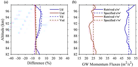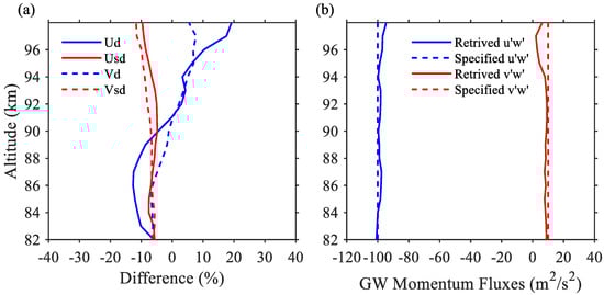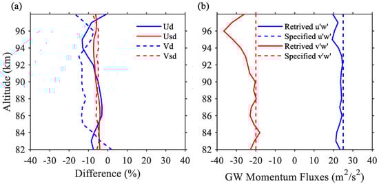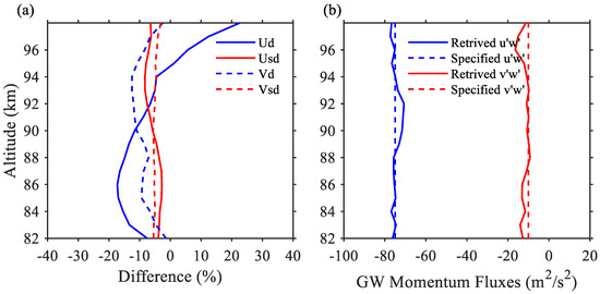 Case 1 represents two high frequency GWs with only a zonal and meridional variation. The periods of the two GWs are 20 and 30 min, which is less than the 2-h time bin. The wavelengths are set to be 30 and 50 km in the zonal and meridional direction, respectively. The two GW amplitudes in the zonal, meridional, and vertical are specified to be (10, 0, 5) m/s and (0, 20, −2) m/s. Hence, the GW zonal and meridional momentum fluxes are calculated to be 25 m2/s2 and 50 m2/s2. The background mean wind, diurnal and semidiurnal tides are given as the typical values. Two-day waves with amplitudes of about 20 m/s in both the zonal and meridional direction are also concerned in this case. Small random fluctuations in the 2-day waves are also considered. Using the detected angular information by the Mohe meteor radar in July 2012, when the meteor counts are large enough, we could estimate the accuracy of the MCD method. Figure 4a shows the differences between the estimated tides and the prescribed ones. Both the diurnal and semidiurnal tides are estimated with an error around 5–10% with an insignificant altitudinal variation. The estimated GW momentum fluxes are illustrated in Figure 4b, with the comparison of the specified ones. Below ~94 km, the MCD method gives a reasonable estimation on both and with the error of less than 5 m2/s2. As the altitude increases to 96 km, the estimated has over a 10 m2/s2 error.