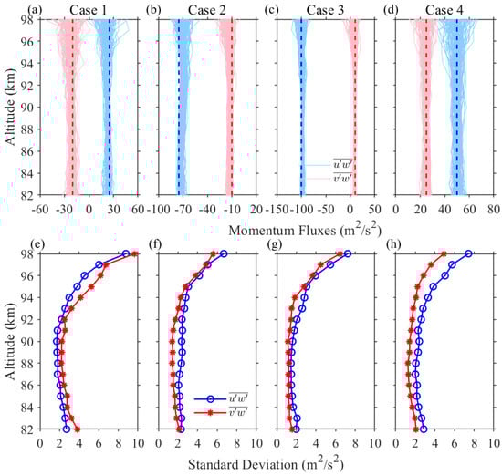 (a–d) Estimated zonal (sky-blue lines) and meridional (pink lines) GW momentum fluxes using the MCD method in each month, for the period between 2012 and 2021. The specific mean GW momentum fluxes are plotted in blue (red) dashed lines. (e–h) The altitudinal variations in the standard deviation of the vertical fluxes of the zonal and meridional GW momentum are plotted in blue solid-circles and red solid-asterisk lines, respectively. Columns from left to right are for Cases 1–4.