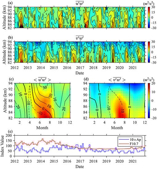 Estimated (a) zonal and (b) meridional GW momentum fluxes in different altitudes, for the period between 2012 and 2021. Contours (c,d) are the averaged results for the zonal and meridional GW momentum fluxes, respectively. Thin black solid (dash) lines indicate the decadal averaged monthly-mean winds with positive (negative) values. Thick black lines are zero winds. (e) Monthly variations of the geomagnetic (Ap, blue line) and solar flux (F10.7, red line) index.