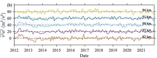 Time series of the detrended and deseasonalized (a) zonal and (b) meridional momentum fluxes at 82, 85, 87, 88, and 94 km, stacking with an interval of 20 m2/s2. The dashed lines are for zeros for each height.