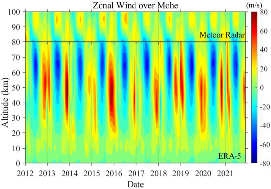 Monthly mean zonal wind over Mohe, from 2012 until 2021. The wind profile below 80 km is provided by the ERA-5 re-analysis data.