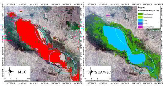 - Precise spatial resolution. Most studies have used medium-low resolution remote sensing images, such as Landsat (30 m) and MODIS (500 m), because of free availability and time-series coverage. The Sentinel-2 images with a high resolution of 10 m was used in our study, and the results show that better spatial resolution can provide better wetland mapping details, as shown in Figure 9. However, to some extent, it requires a higher storage performance and increases the complexity of the computing process. Simultaneously, there were more detailed interference problems. With big data, cloud computing and artificial intelligence (AI) have made great progress, providing huge opportunities for obtaining and analyzing huge amounts of data to support the Ramsar strategic plan 2016–24 and the SDGs.