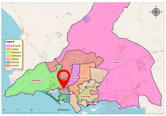 This study focuses on Pakistan’s largest metropolitan city, Karachi, the capital of the Sindh province. It is the twelfth-largest city in the world, with a population of over 12 million people. Karachi comprises seven districts: the Karachi Central, Karachi East, Karachi South, Karachi West, Korangi, Malir, and Keamari districts. Additionally, Clifton is part of the Karachi South district, which is our main research area for this study. Figure 1 shows the Karachi map with all districts, and the location symbol indicates the Clifton area on the map.