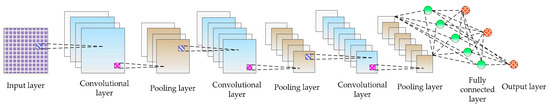 Fukushima and Miyake (1982) [42] proposed a convolutional neural network (CNN) in 1980, which was then updated by LeCun et al. (1989) [43]. A number of areas in which CNN has succeeded in recent years include synthetic biomedicine [44], catastrophe detection [45], natural language processing [46], holographic image reconstruction [47], the artificial intelligence program of Go [48], optical fiber communication [49], and so on. Using high-performance computing platforms like high-performance computers, graphics workstations, cloud computing platforms, etc., it is now possible to train complicated models using large-scale datasets. There have been a wide array of convolution neural network models developed in this regard, including ZFNet [50], GoogleNet [51], LeNet [52], MobileNets [53], VGGNet [54], Overfeat model [55], DenseNet [56], SPPNet [57], ResNet [58], AlexNet [59], and so on. A CNN is a multilayer network with a fundamental structure that is mostly composed of the following layers: the input layer, the convolutional layer, the pooling layer, the completely connected layer, and the output layer, as illustrated in Figure 4.