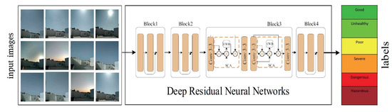 Machine learning (ML) has recently achieved substantial advancements in numerous areas, including speech and image recognition, with improved eminent excellence. The convolutional neural network, abbreviated as CNN, has seen extensive use in research in the fields of computer vision and image processing, with credible performance in attempting various inspiring tasks on classification and estimation [18,19,20,21,22,23,24,25,26]. The use of machine learning and deep learning methods in analyzing air quality has grown in popularity in recent years [27,28,29]. Air pollution has been classified or estimated using image processing in many studies [12,30,31,32]. Additionally, an image-based air pollution estimate provides a promising future; however, few such studies have been conducted in this context. Therefore, more investigation into image-based air quality estimates is needed to boost accuracy and reliability. Due to the rapid growth of machine learning algorithms and computer vision technology, recently, many automatic algorithms have been offered as potent tools to address the crack detection difficulties in practice [33]. With the use of deep convolutional neural networks (DCNNs) and an improved chicken swarm algorithm, the authors of [34] created a visual method for diagnosing cracks (ECSA). To better forecast and analyze the air pollution generated by Combined Cycle Power Plants, a novel hybrid intelligence model based on long short-term memory (LSTM) and multi-verse optimization algorithm (MVO) has been created [35,36]. This developed a deep learning model to predict PM2.5 atmospheric air pollution using meteorological data, ground-based observations, and big data from remote-sensing satellites. To forecast the concentration of air pollutants in various areas inside a city, using spatial-temporal correlations, a convolutional neural network with a long short-term memory deep neural network (CNN-LSTM) model was developed [37]. Using a recurrent neural network deep learning model, the presence of SO2 and PM10 in the air of Sakarya city was demonstrated [38]. In order to forecast the quality of the air, [39] a spatio-temporal deep learning model called Conv1D-LSTM, which integrates a deep convolutional neural network (1D CNN) with a long short-term memory (LSTM) to extract spatial and temporal correlation data, was presented [40]. The model presented the application of an attention-based convolutional BiLSTM autoencoder model for air quality forecasting.