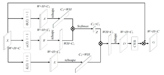 Firstly, the input feature graph is created first using and operations to form a new feature graph of and , as seen in Figure 2. The and operations indicate convolutional layers containing batch normalization [62] and ReLu layers [63]. The size of the convolution kernel can be adjusted to in order to limit the amount of calculation required. Where , the dimension of channel can be lowered, as well as reducing the number of matrix multiplication calculations required. The feature map to is resized and then transposed to when the reshape is complete. Finally, multiply and in matrix fashion and apply the softmax function to produce a map of of the channel’s correlation. The equation is given below: