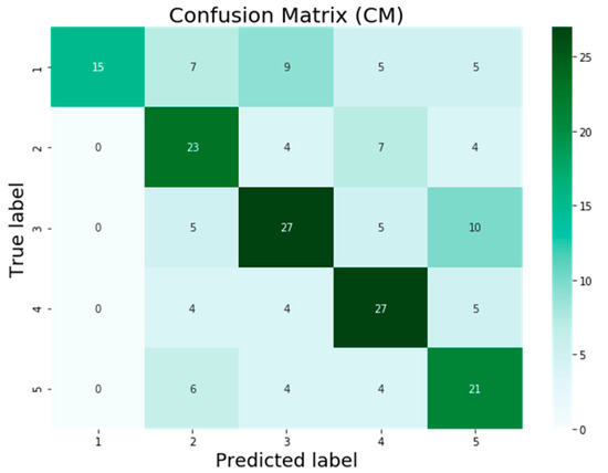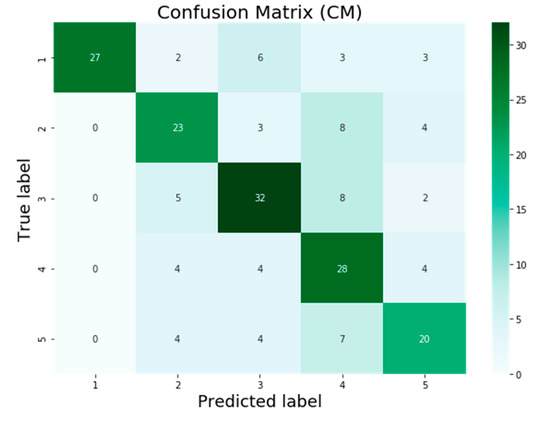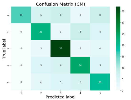 The confusion matrix is presented in Figure 7, Figure 8, Figure 9 and Figure 10 for the four machine learning models SVM, VGG16, InceptionV3, and AQE-net that have been deployed in this study. The numbers 1 to 5 on the horizontal axis reflect the values that were predicted for the test samples, and the values 1 to 5 on the vertical axis represent the actual values of the test samples, respectively. In Figure 7, Figure 8, Figure 9 and Figure 10, the values that are on-diagonal show the number of correctly classified photos, whereas the values that are off-diagonal reflect the number of images with incorrect classifications that vary from the diagonal. After applying the SVM model to the KHI-AQI testing dataset, the confusion matrix is displayed in Figure 7 below. In accordance with the findings, the SVM model successfully classified 113 out of 201 samples, whereas it mistakenly classified 88 samples. In total, there were 201 samples included in the study. The confusion matrix for the KHI-AQI testing dataset using VGG16 is depicted in Figure 8. It was found that 119 of the samples were correctly categorized across all classes, whereas 82 of the samples were misclassified. When compared to the SVM model, the VGG16 algorithm provided six more results that were correctly categorized. After running VGG16 on the same testing dataset, the InceptionV3 algorithm was then applied; the confusion matrix for the InceptionV3 model can be seen in Figure 9. The findings show that out of 201 samples, only 130 were correctly identified using the InceptionV3 model, while 71 samples were incorrectly classified. InceptionV3 had 11 more correctly classified results than VGG16. After first attempting to use the SVM, VGG16, and InceptionV3 models, we finally attempted to validate our proposed model, AQE-Net, by applying it to a testing dataset. Figure 10 presents the classification results using the confusion matrix generated by the AQE-Net model after it was applied to the testing dataset. Out of 201 possible classifications, there were a total of 144 accurate classifications, while there were 57 wrong classifications. AQE-Net was found to have delivered 14 more correct classifications than InceptionV3, according to the findings. When it comes to the categorization of images with AQI levels, the overall confusion matrices on classification results obtained by models indicate that AQE-Net is more superior than other models.