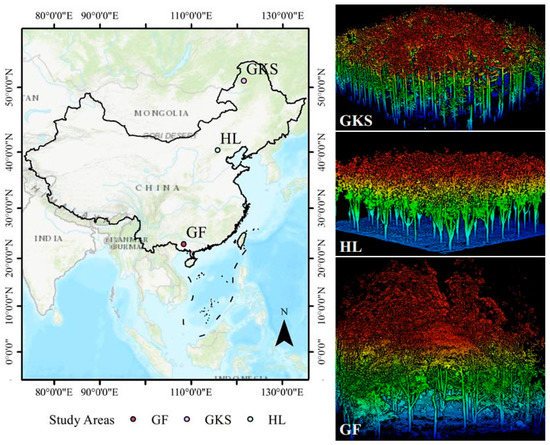 Experimental data were collected from three study areas in China: The Greater Khingan Station (GKS), Huailai Remote Sensing Comprehensive Experimental Station (HL), and Gaofeng forest farm (GF). Point cloud data from forest plots in the study areas were collected in September, July, and April of 2021, using a LiBackpack DGC50 backpack laser scanning (BLS) system from Beijing GreenValley Technology Co., Ltd. (Beijing, China). The LiBackpack DGC50 system has an absolute accuracy of ±5 cm, a relative accuracy of 3 cm, and is equipped with two VLP 16 laser sensors that can reach a scanning range of 100 m, with vertical and horizontal scanning angles of −90° to 90° and 360°, respectively. Figure 1 shows the distribution locations of the three study areas and the LiDAR data of some sample sites. LiDAR data were collected from 17, 41, and 16 ground sample plots in the three experimental areas of GKS, HL, and GF, respectively. A total of eight types of tree species were included in the three experimental areas. Table 1 provides a detailed representation of tree species and forest plot information.