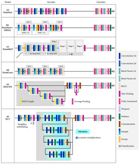 We conducted tree species classification research using four types of point cloud deep learning approaches: pointwise MLP, convolution-based, graph-based, and attention-based models. The second module in Figure 2 shows the categories of models used, along with the names of the specific models. To facilitate comparison and analysis of the models, the structures of all models are summarized and drawn in a single image (Figure 3). Additionally, the hyperparameters used in the training process of all the deep learning models are summarized in Table 2. We maintained the parameters used by the original authors of the models as much as possible.