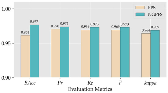 We conducted deep learning training and testing experiments using the PointNet++ model on sample data from both the FPS and NGFPS methods. We aggregated the results of the optimal model obtained from the training and analyzed them. We recorded the model evaluation metrics for both the FPS and NGFPS approaches on the test data set. All of these results are presented in Figure 4. As can be seen from the figure, all model evaluation metrics were optimal in the results using the NGFPS method; notably, the balanced accuracy (BAcc) of the NGFPS experimental results was significantly higher than that of the FPS (by 0.02). The results of the model classification were close to perfect and almost identical, as can be seen from the kappa coefficient values.