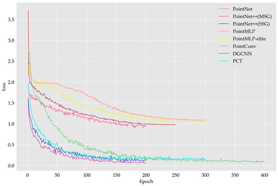 We could not evaluate different models exclusively with respect to the magnitude of the value of the loss, as different models use different processes for the calculation of the loss during the training of the model. However, we could compare models of the same type or models with the same loss processing method. Figure 6 shows that the loss of all the models decreased and eventually plateaued. This indicated that the training of all models was stable. PointNet and PointNet++ used the same model training strategy. The loss value of PointNet++ was eventually stable and close to 0, but the loss of the PointNet model was higher, with value stabilizing at approximately 1. This indicates that the classification performance of the PointNet model was worse than that of PointNet++. The loss values of the DGCNN and PointMLP models also finally stabilized at approximately 1.
