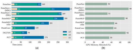 We counted the time spent for each model to train in the tree species classification experiment, which are plotted in Figure 8a, while Figure 8b displays the GPU memory occupancy of each model during training. As shown in Figure 8, the time required for training PointNet++ and PointMLP to obtain the optimal model parameters was longer. PointMLP-elite is a streamlined and lightweight version of PointMLP, with a model runtime reduction of 70 min, approximately 30% less than that of PointMLP. Using the same training parameters, the GPU memory of the PointMLP-elite model was reduced by 24%. Three models—PointConv, DGCNN, and PCT—took less time for training, but DGCNN had a higher GPU memory allocation.