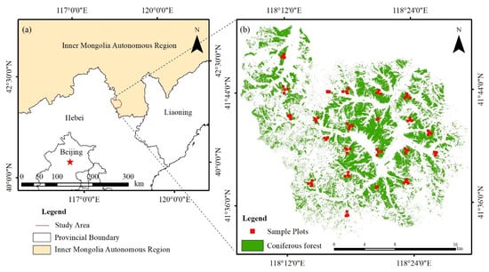 (a) Locations of the study area and (b) distribution of sample plots within the coniferous forest in the Wangyedian forest farm.