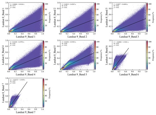 The scatter plots of Band 1 to Band 7 of Landsat 8 and Landsat 9 images in Wangyedian.