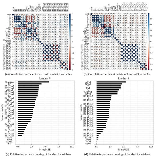 Correlation coefficient matrix of (a) Landsat 8 variables and (b) Landsat 9 variables; the relative importance ranking of (c) Landsat 8 variables and (d) Landsat 9 variables.