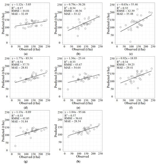 Scatter plots of the predicted AGB against the observed AGB values in Wangyedian using: (a) Landsat 8 and MLR, (b) Landsat 8 and SVM, (c) Landsat 8 and BPNN, (d) Landsat 8 and RF, (e) Landsat 9 and MLR, (f) Landsat 9 and SVM, (g) Landsat 9 and BPNN, and (h) Landsat 9 and RF.