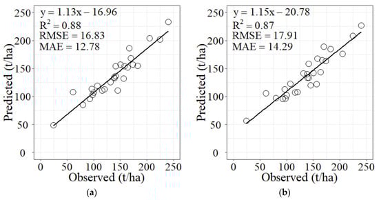 Scatter plots of the predicted AGB by regression kriging against the observed AGB values in Wangyedian using: (a) Landsat 8 and (b) Landsat 9.