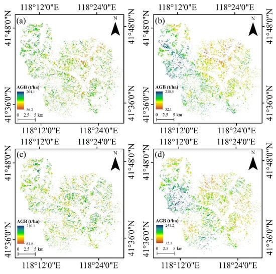 Spatial distributions of forest AGB in Wangyedian using (a) the Landsat 8 with RF, (b) the Landsat 8 with regression kriging, (c) the Landsat 9 with RF, and (d) the Landsat 9 with regression kriging.