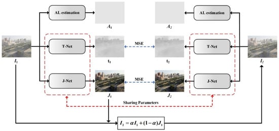 Now, the hazy image and the re-degraded hazy image follow a similar haze imaging model with the same scene radiance and the same global atmospheric light . Furthermore, as the mixing ratio is a preset fixed parameter, the relation of and is known, i.e., . Therefore, the re-degradation haze imaging model explained by Equations (9) and (10) can be implemented to regulate the dehazing network. Assuming a dehazing network, , which estimates the haze-free image by , atmospheric light by , and transmission map by , respectively. Therefore, given the hazy image and the re-degraded hazy image as inputs, the dehazing network tries to output two similar haze-free images ( and ), two similar atmospheric lights ( and ), and two transmission maps with fixed relation ( and ).
