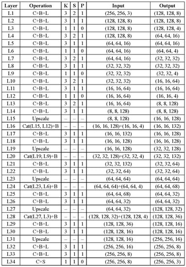 A detailed configuration of the J-Net. ‘C’ denotes the convolution layer. ‘B’ denotes batch normalization. ‘L’ denotes Leaky ReLU activation. ‘Upscale’ denotes bilinear upscale layer. ‘S’ denotes Sigmoid activation. ‘Cat’ denotes concatenate operation as the skip connection. ‘K’ denotes the kernel size. ‘S’ denotes the stride size. ‘P’ denotes the padding size. ‘Input’ denotes the input image size (h × w × c). ‘Output’ denotes the output image size (h × w × c).